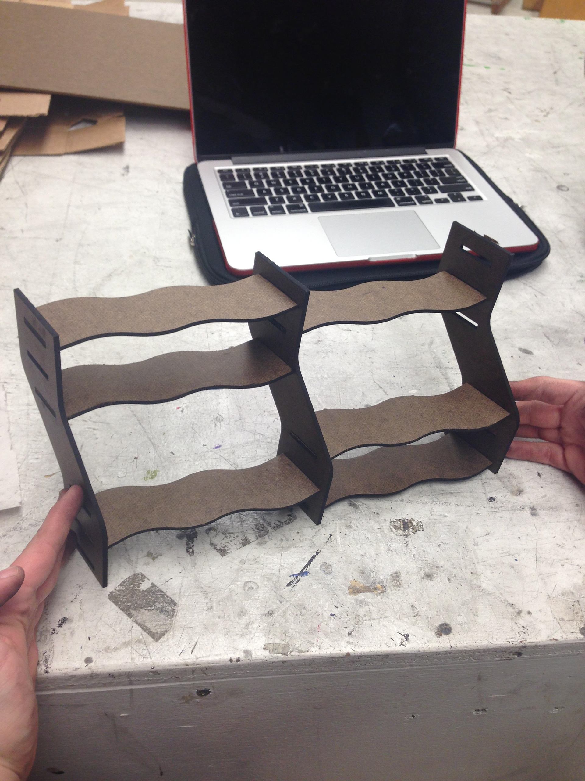 I also found that my upright pieces needed some adjusting after my first cut. Not only were my slots different distances from the top and bottom edges, but also the innermost slots shifted with the curve in the piece. This was problematic for the specific composition of the pieces I had in mind, so along with making the piece at a larger scale, I also had to fix some spatial issues.